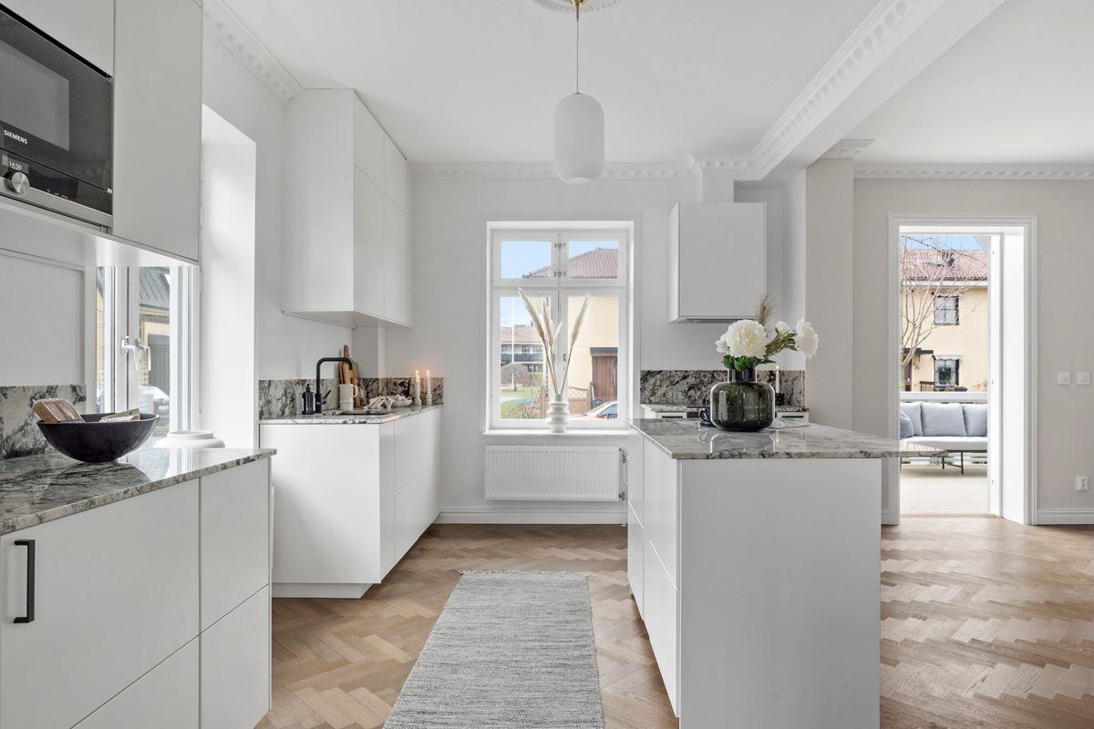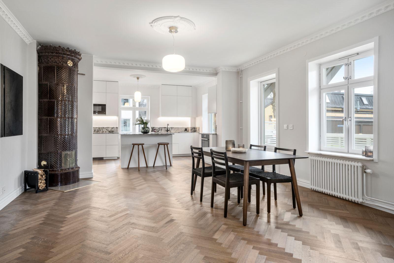 Här ges möjlighet att förvärva lägenheter i unik boendeform med villa känsla i absolut högsta kvalité och yppersta toppklass. Här möts gammalt och nytt med allt ifrån tidstypiska detaljer såsom högt i tak, fiskbensparkett, kakelugn, djupa fönsternischer och stuckaturer, blandat med stilren elegans, det bästa av två världar. Inget annat att jämföra med, vilket gör detta boende helt unikt och extraordinärt. Detta passar inte alla, utan bara de särskild utvalda, därför bör man inte gå miste om detta unika tillfälle! Här erbjuds endast tre lägenheter som saknar motstycke för den som har exceptionellt höga krav med låga driftskostnader och fria möjligheter att förfoga över sin bostad. Till varje lägenhet ingår en carport och stort källarförråd, dessutom finns det två gästparkeringar till förfogande.