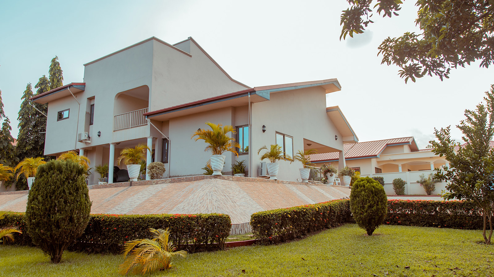 En härligt lummig trädgård med gräsmattor, körsbärsträd, och en mängd prydnadsväxter.